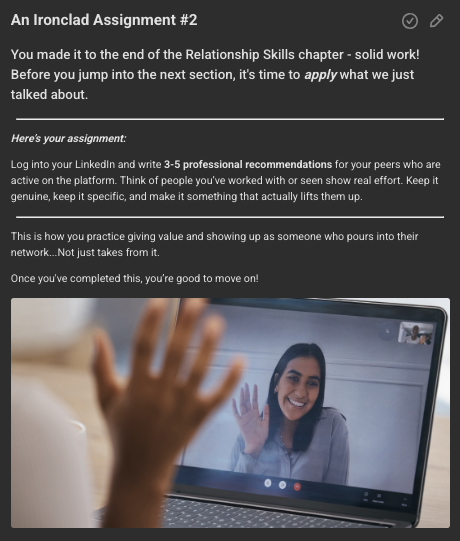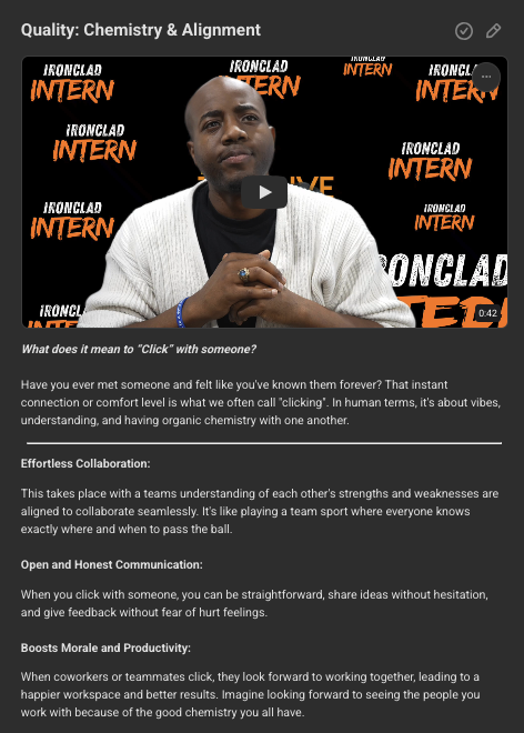 The Ironclad Intern Course on SKOOL is a guided, interactive learning experience designed to help students and emerging professionals build real-world confidence, structure, and career readiness. Through short lessons, practical assignments, and reflective exercises, the course breaks down how to communicate professionally, manage expectations, and take ownership in any work environment.